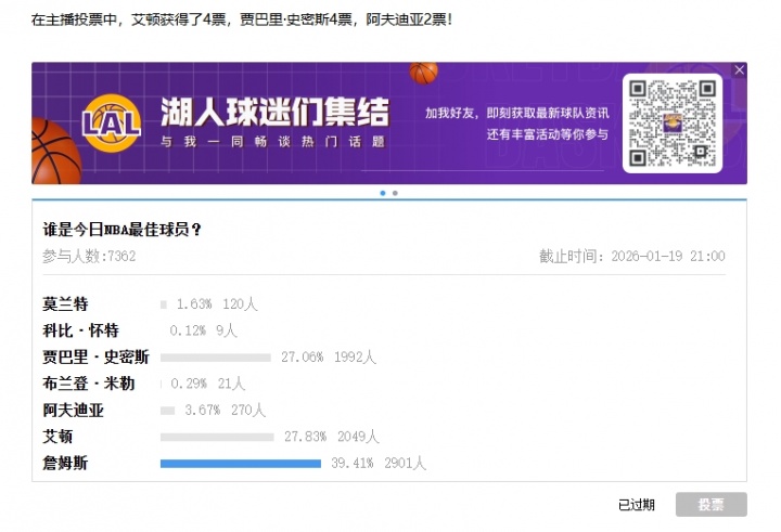 在主播投票中,艾顿获得了4票,贾巴里·史密斯4票,阿夫迪亚2票!